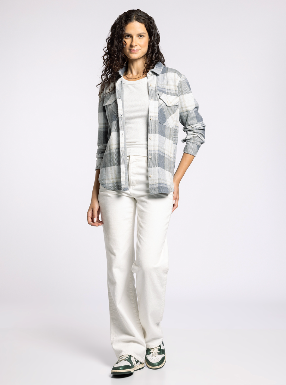 This grey/beige flannel is the perfect blend of style and comfort, making it the perfect addition to any wardrobe. This versatile piece combines the best elements of a shirt and a jacket, offering a cozy feel indoors and out.