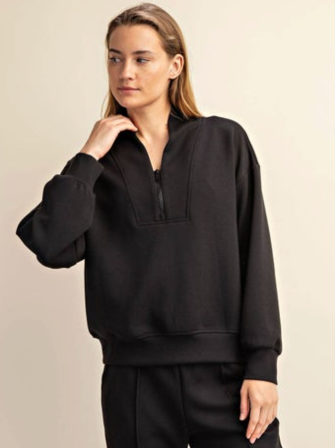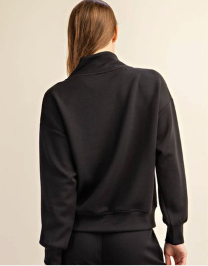 Crafted from a sumptuous, silky smooth fabric, this modal scuba jacket is exceptionally soft and lightweight for a luxurious feel. It is complemented by a half-zipper closure, bubbled sleeves and creates a fashion-forward look. With a convenient front pocket and dropped shoulder design, it seamlessly combines comfort and trendiness.